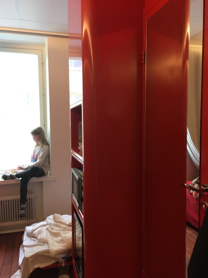 Minulla oli kännykässä Omena Hotellilta tullut tekstiviesti, jossa luki ovikoodi. Näpyttelimme sen ja pääsimme sisälle hotelliin. Ovikoodin saa aina vasta samana päivänä, joten ei kannata stressata siitä miten hotelliin pääsee, koodi tulee noin kahdeksan tuntia ennen varauksen alkamista. Kun pääsimme sisään hotellihuoneeseen pikkusiskoni tokaisi heti ”tämä on juuri sellainen hieno huone, kuin oli netistä katsonut”. Riisuimme heti märät vaatteet ja laitoimme niitä ympäri huonetta kuivaamaan. Plussaa muuten Omena Hotellille siitä, että huoneessa on kyllä rajattomasti kuivaustilaa 😀 Kaivoimme matkatavaroista kuivat vaatteet, mutta huomasimme, että nekin olivat litimärkiä, sillä matkakassi oli kastunut myös läpimäräksi. Eli kaikki vaatteemme mitä meillä oli mukana olivat litimärkiä – nice. Mulla oli onneksi ollut jalassa kumisaappaat, mutta muilla oli kengätkin kastuneet.