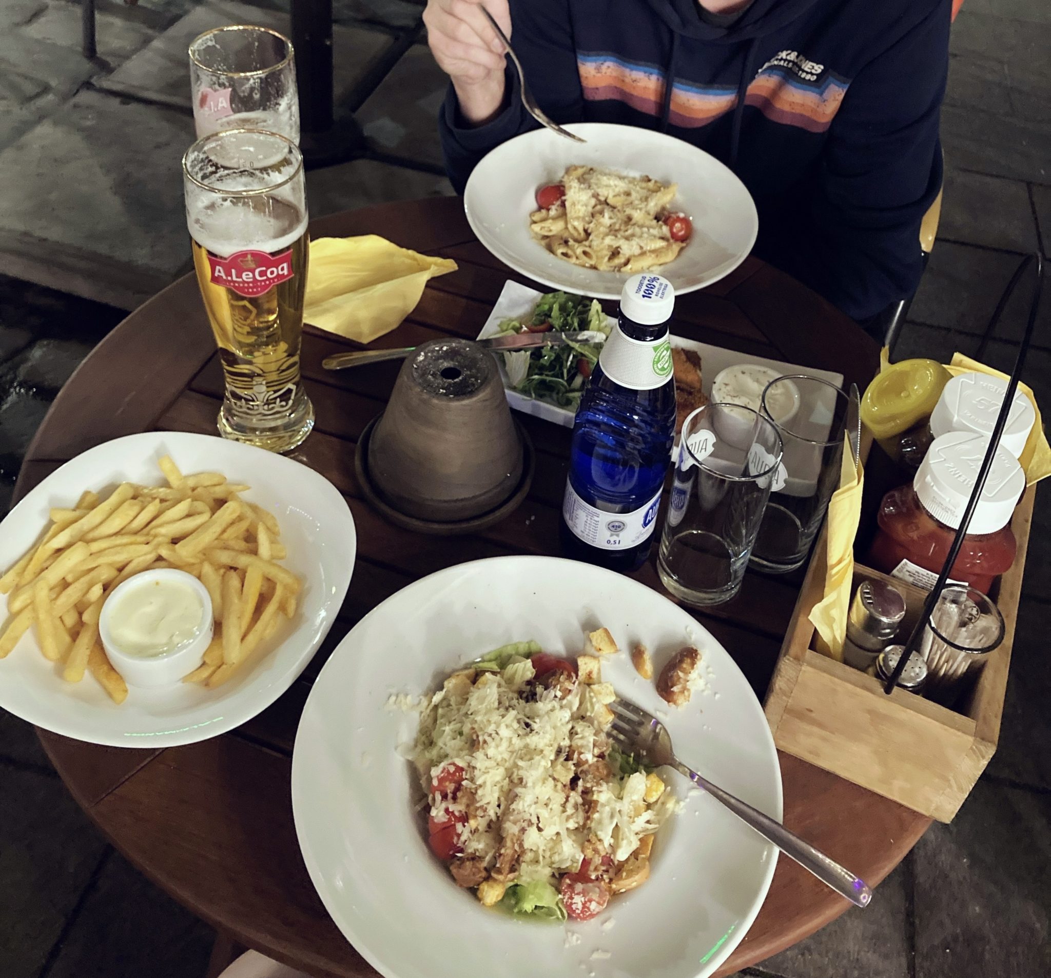 Illalla suunnattiin vielä syömään viimeisen illan dinneri vanhaan kaupunkiin ravintolaan, jonka nimeä on nyt muista kuollaksenikaan. Haluttiin väkisin istua ulkoterassilla ja tarjoilija varotti, että Tallinnaan on tulossa kauhea ukkosmyrsky, että ihan omalla vastuulla sitten. Ehdittiin onneksi hyvin syömään ennen myrskyä eikä edes kastuttu. Dinnerin jälkeen otettiin taas Uberi hotellille ja mentiin tavaroiden pakkaamisen jälkeen unille.