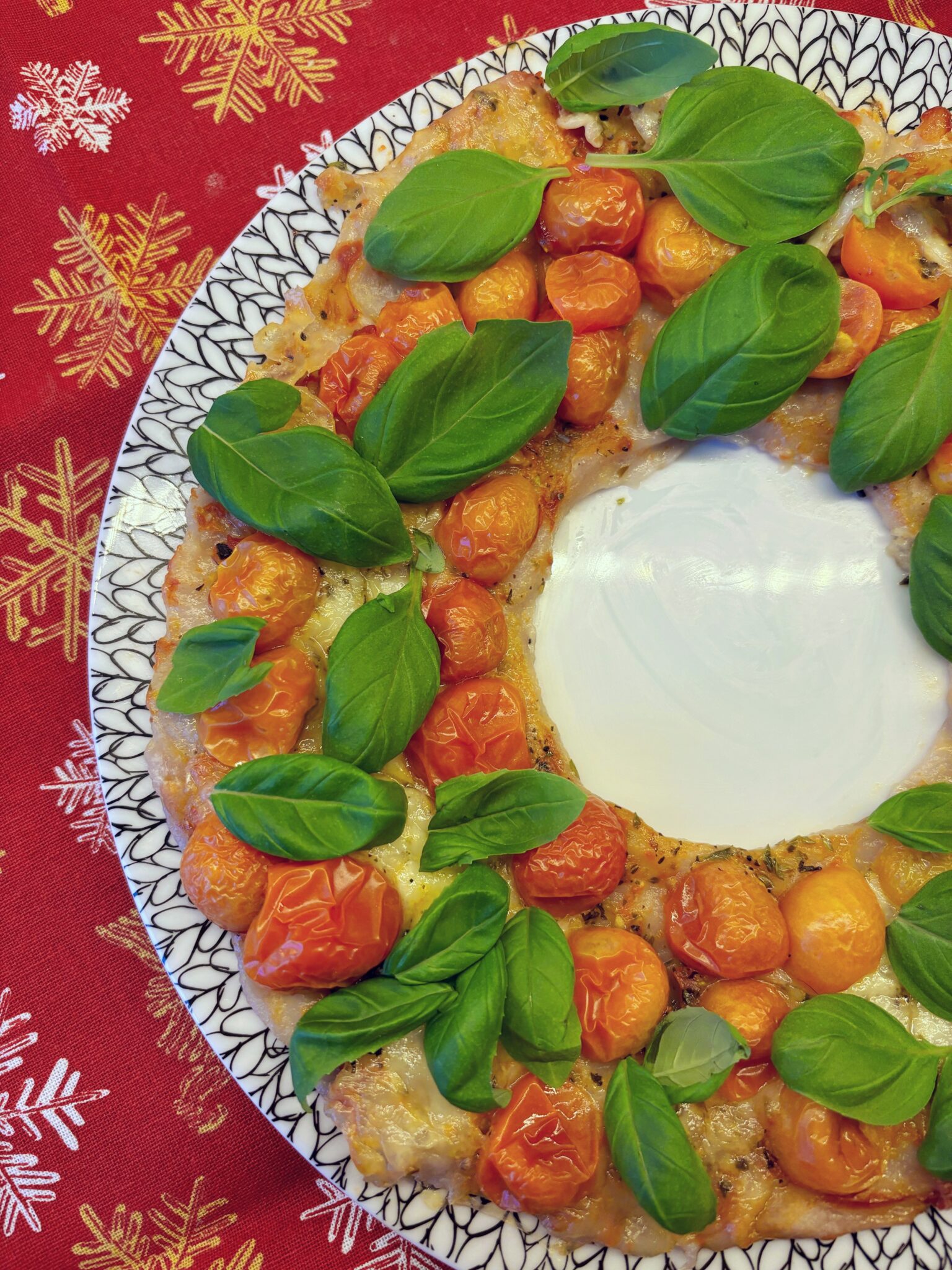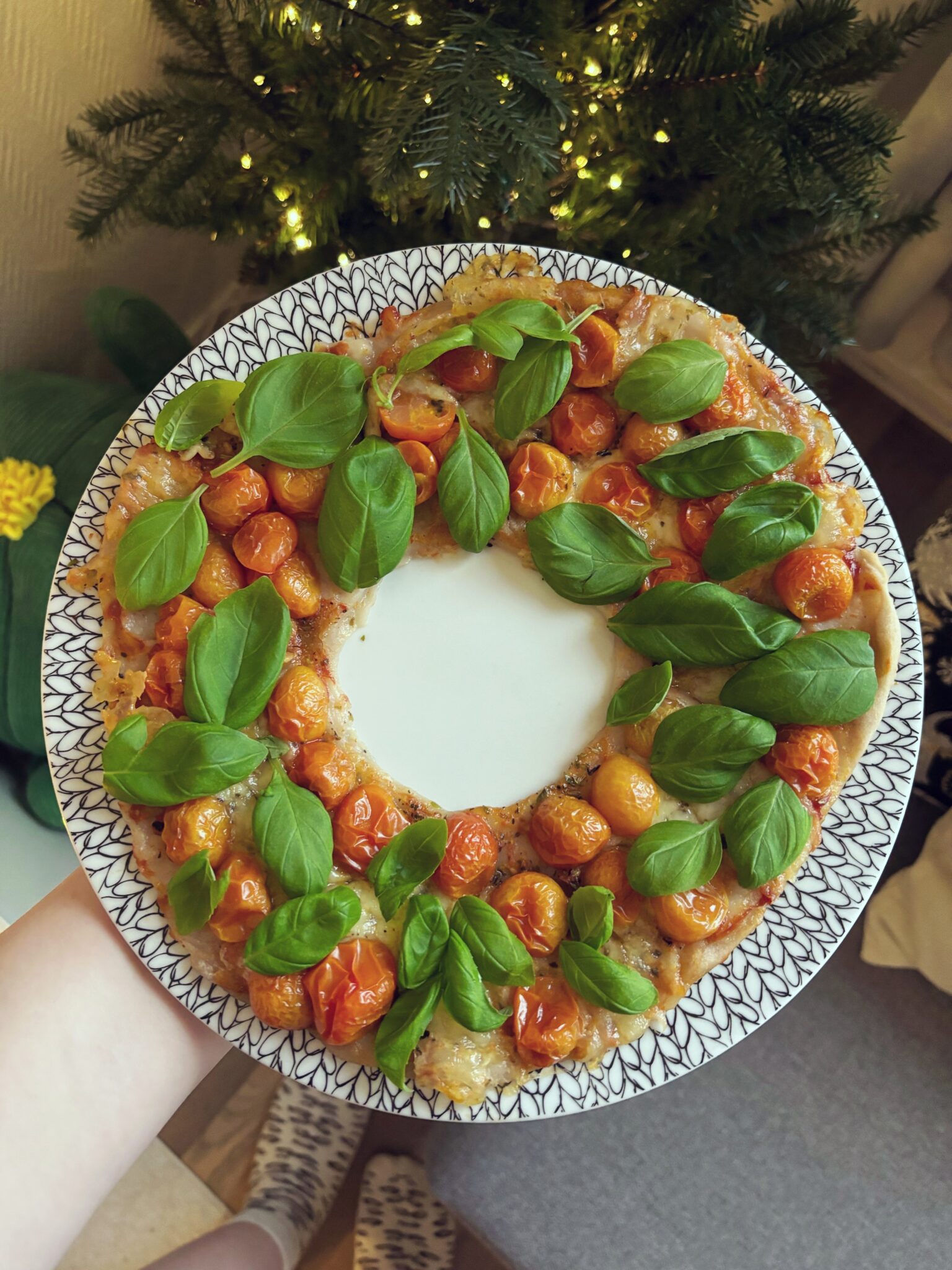 Maku oli oikein bueno ja itse tykkään juuri margarita-pizzasta, joten makumaailma oli itselleni täydellinen. Toki voit täyttää kranssin myös muulla tapaa. Mun mielestä tästä tuli oikein söpö tarjoiltava esim. pikkujoulujen tai joulunpyhien brunssipöytään 🙂