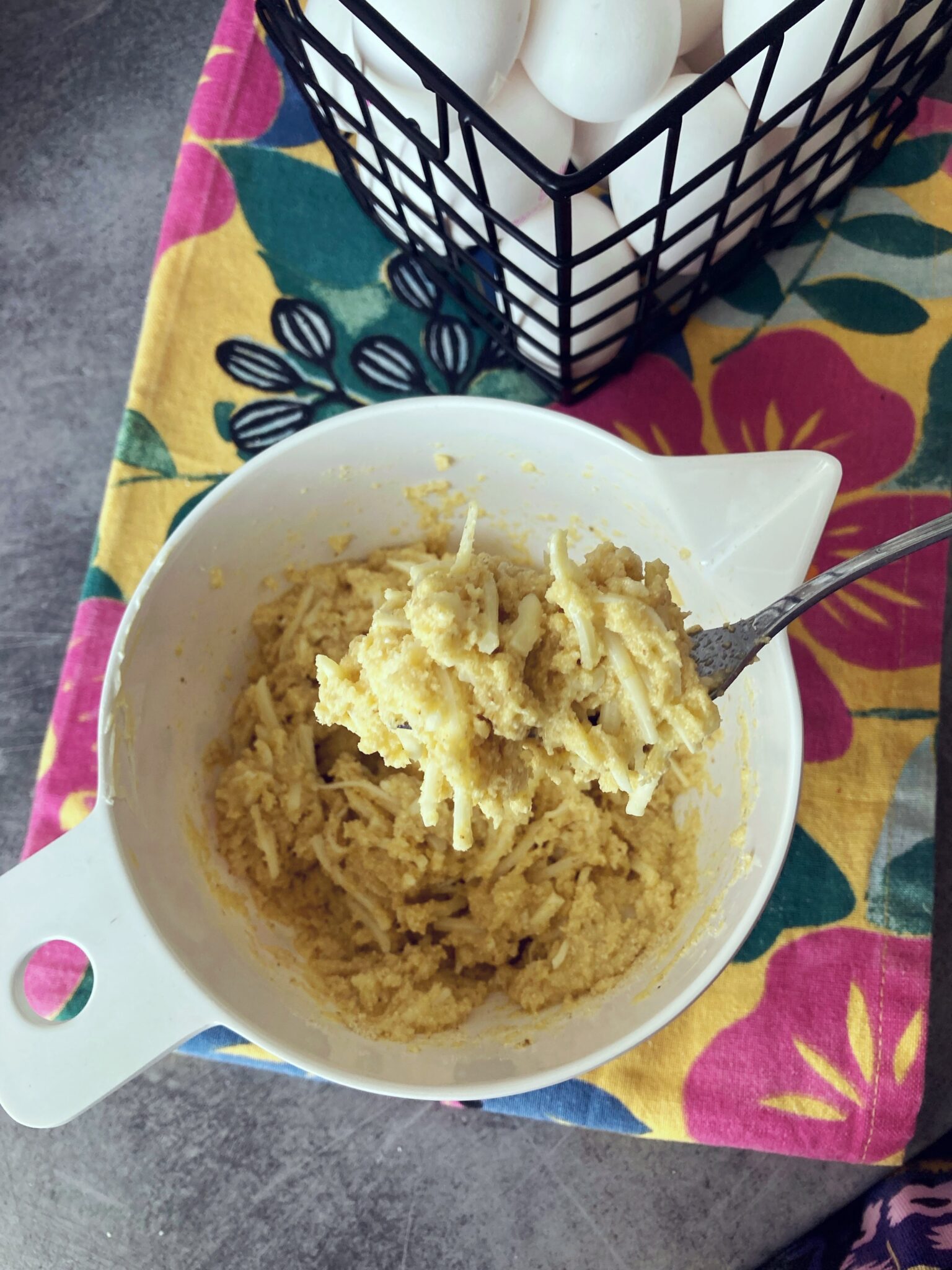 - Riko munat ja sekoita sekaan juustoraaste sekä suola.