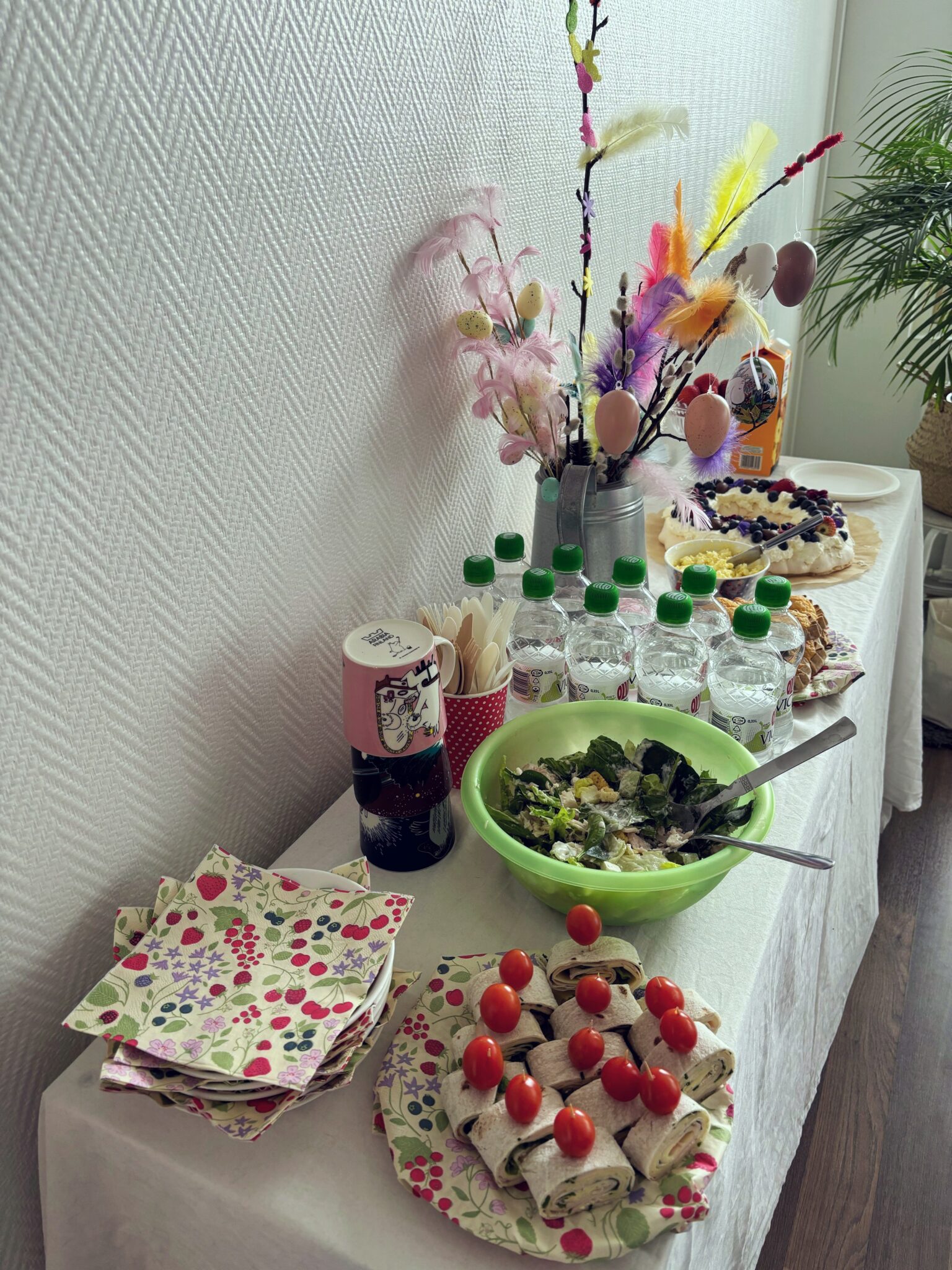 Järjestin pääsiäismaanantaina brunssin sukulaisille meidän kotona. Siskoni oli meillä yökylässä ja hän auttoikin paljon ruoan laitossa minua. Teimme minitortilloita, marenki-kranssin, kanasalaattia ja lisäksi tarjolla oli karjalanpiirakoita munavoinkera sekä pääsiäiskarkkeja. Oli mukava viettää yhdessä aikaa ja herkutella. Mulla oli jääkaapissa myös skumppaa ja appelsiinimehua ajatuksena tehdä mimosaa, mutta unohdin ihan kokonaan tarjota niitä sos 😀