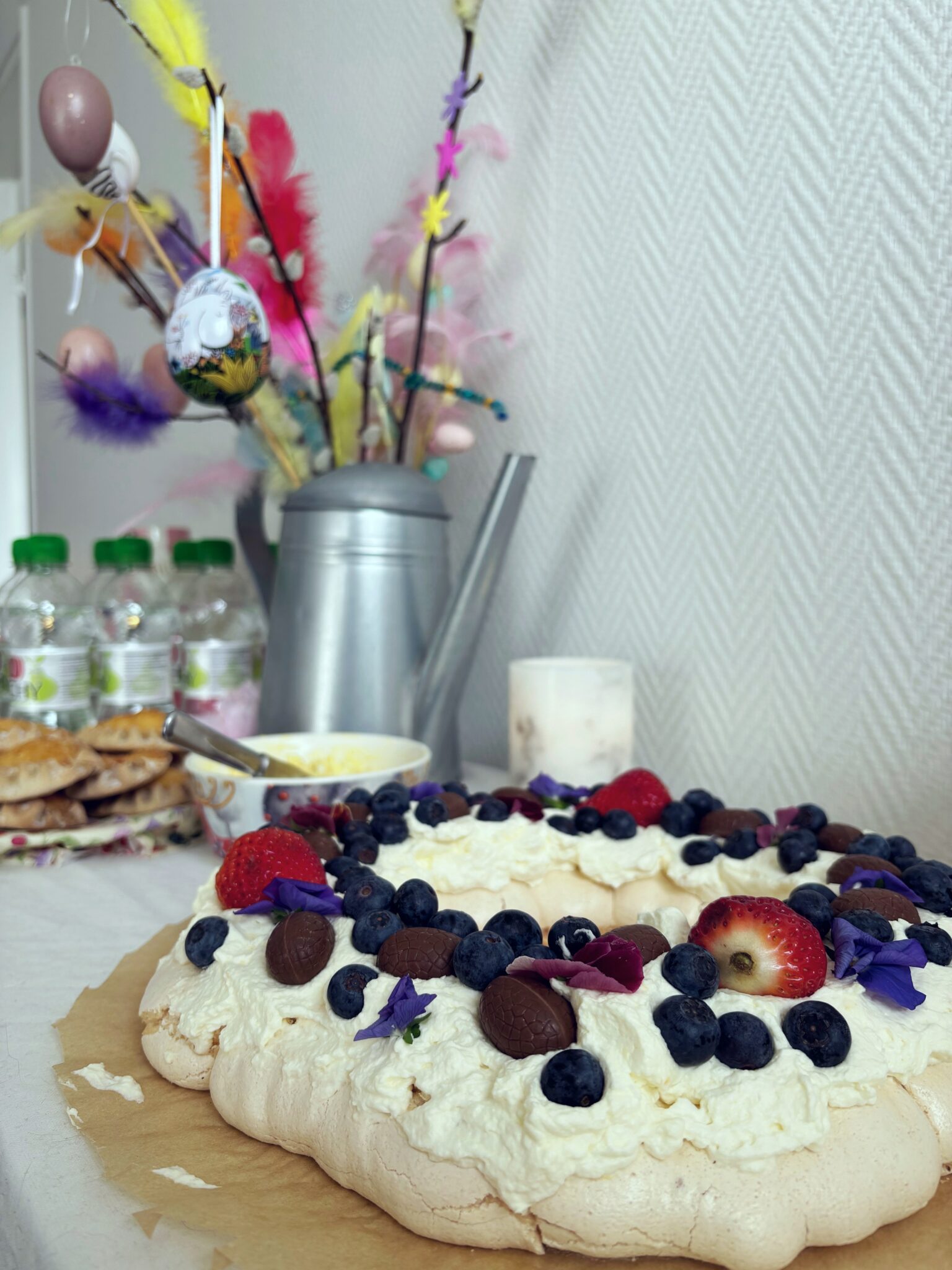 Kesä ja kakut ne yhteen sopii vai mitä? Tehtiin pääsiäisbrunssille suloinen marenkikranssi, joka koristeltiin marjoilla, syötävillä kukilla ja suklaamunilla. Tämä kakku toimii täydellisesti myös kesään, sillä tässä ei ole montaa raaka-ainetta ja tämä on helppo valmistaa vaikka mökilläkin 🙂