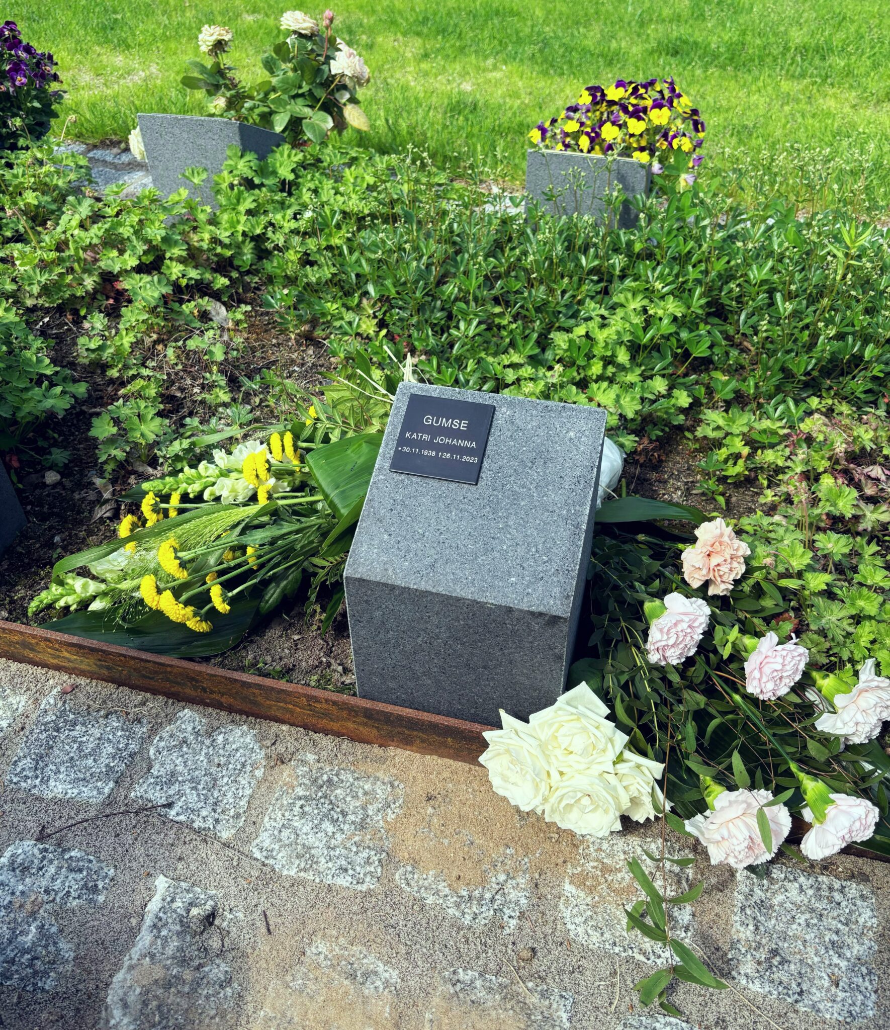 Mamma menehtyi viime marraskuussa ja vietimme hänen hautajaisiaan joulukuussa. Mamma tuhkattiin ja meille infottiin, että tuhkien hautaus onnistuu Katariinan uuteen tuhkahautalehtoon ainostaan touko-lokakuun välillä, kun maa ei ole jäässä. Niinpä nyt vihdoinkin pääsimme toukokuussa hautaamaan hänet. Saimme itse kaataa uurnasta tuhkat maassa olevaan koloon ja sen jälkeen lapioimme sen päälle hiekkaa. Pappi oli mukana tekemässä pienen siunauksen ja rukouksen. Kylläpä tuli taas itkettyä, ei sitä ymmärrä vieläkään, ettei toista näe enää koskaan. Jotenkin vaan jatkuvasti ajattelen, että mamma on Uudessakaupungissa, enkä ymmärrä sitä, että hänestä ei ole enää mitään muuta jäljellä kuin ihanat muistot.
