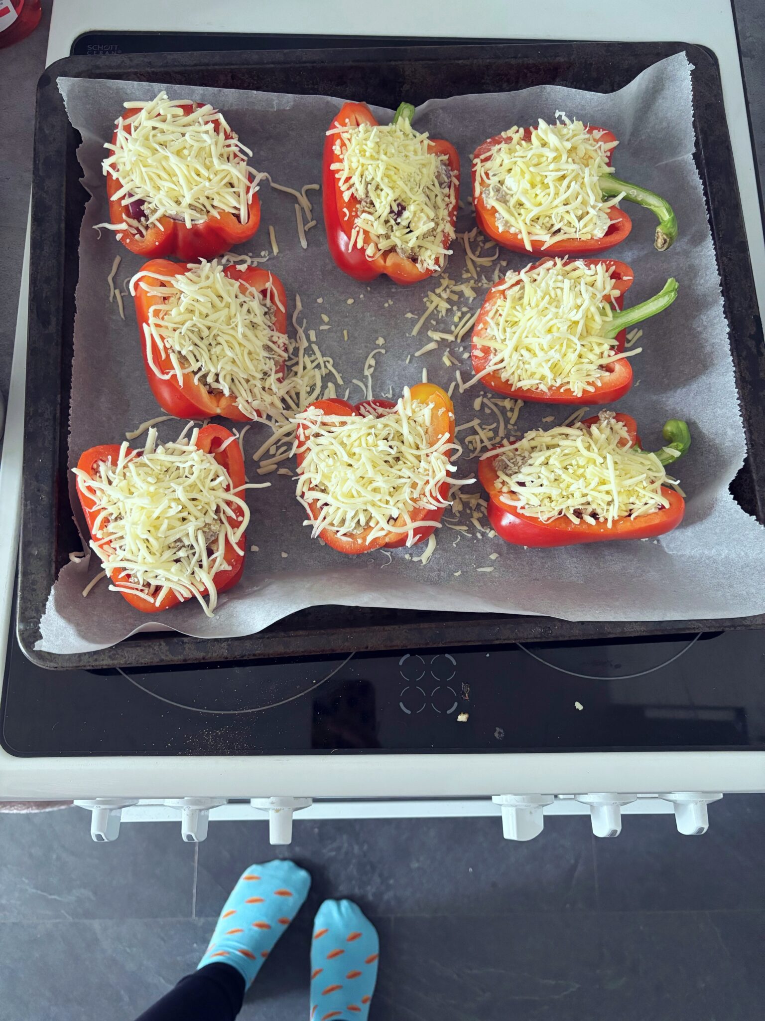 8. Ripottele paprikoiden päälle juustoraastetta.