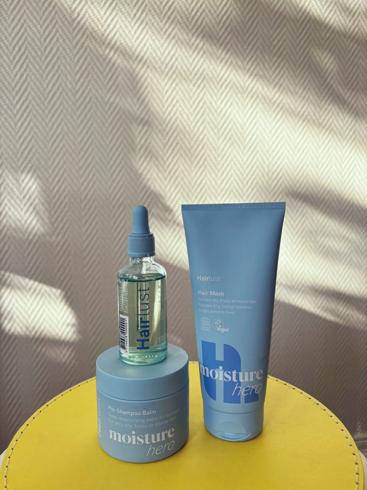 Hairlustilla on monta tuotesarjaa eri hiustyypeille. Heidän nettisivuilla voi tehdä kätevän hiustestin, joka kertoo suoraan mikä tuotesarja sopii juuri sinun hiuksille. Hiustestissä käydään läpi oma hiustyyppi, hiusten paksuus ja väri. Lisäksi hiustestissä käsitellään hiuspohjaa, hiustenlähtöä, kaksihaaraisia ja vaikka mitä. Itse tein testin ja minulle testi kertoi, että hiukseni janoavat kosteutta eli ovat todella kuivat. Tuotesuosituksena hiustesti suositteli minulle Moisture Hero -tuotesarjaa, joka auttaa syväkosteuttamaan hiuspohjaa ja hiuksia.