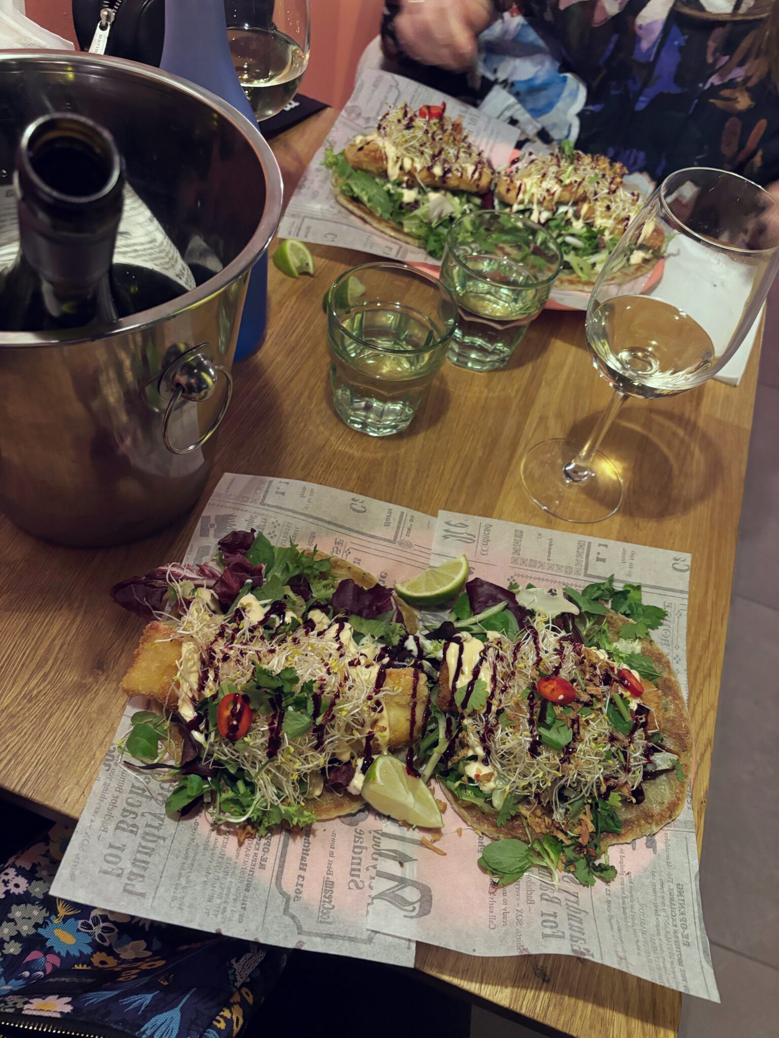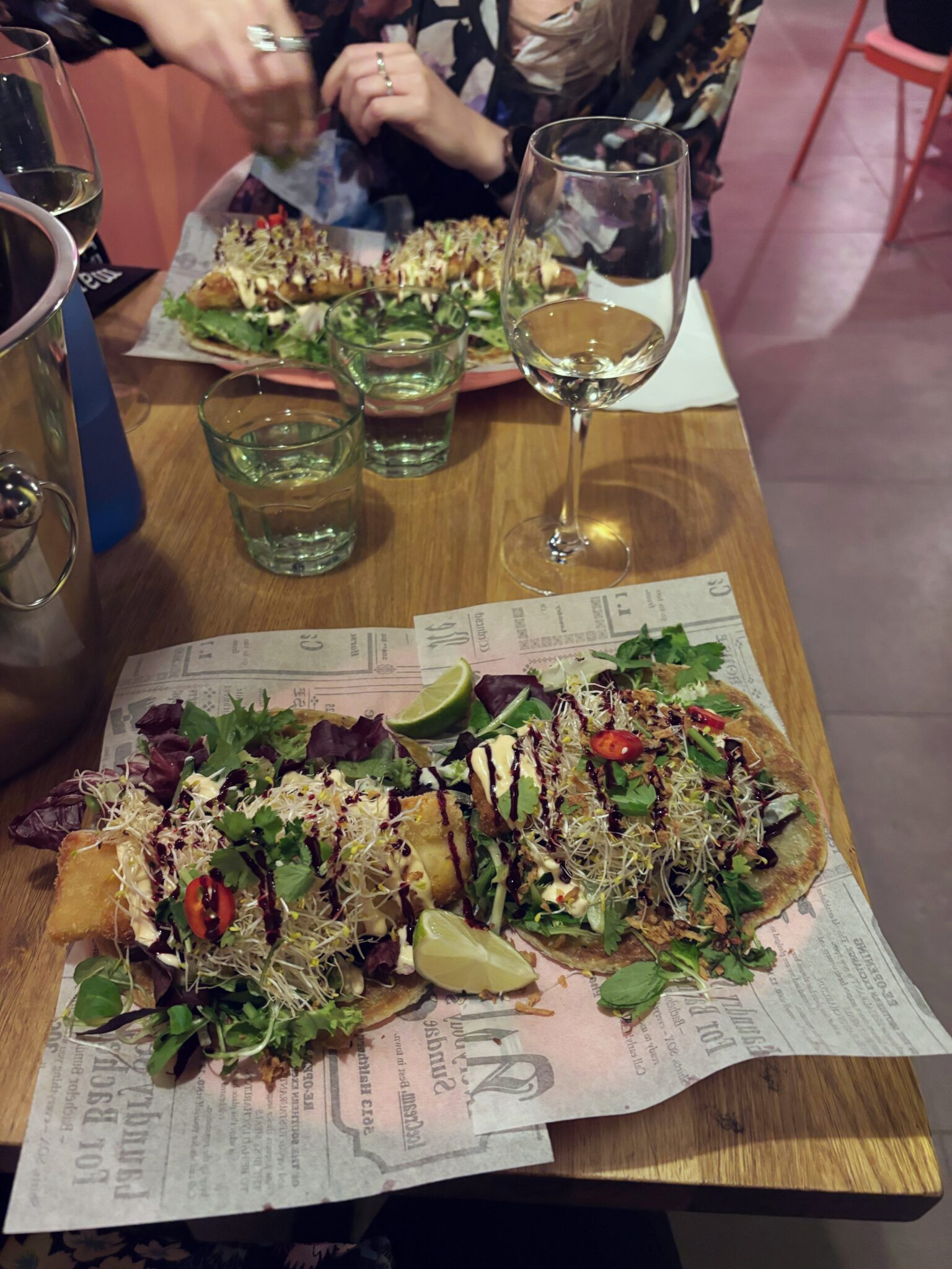 Annokset sisälsivät kaksi isoa tacoa per pää ja voin sanoa, että oli kyllä hyvää. Kaikki maut sopivat niin hyvin yhteen ja en olisi kyllä sellaista makujen maailmaa osannut esim. kotona rakentaa. Otettiin tacojen kylkeen pullo valkkaria ja oli ihana syödä ja höpötellä rauhassa. Mulla teki ihan tiukkaa saada kaikki syötyä ja tulin todella täyteen. Palvelu oli ystävällistä ja ravintola oli kaikin puolin siisti. Voisin ehdottomasti mennä Liemeen uudestaankin.