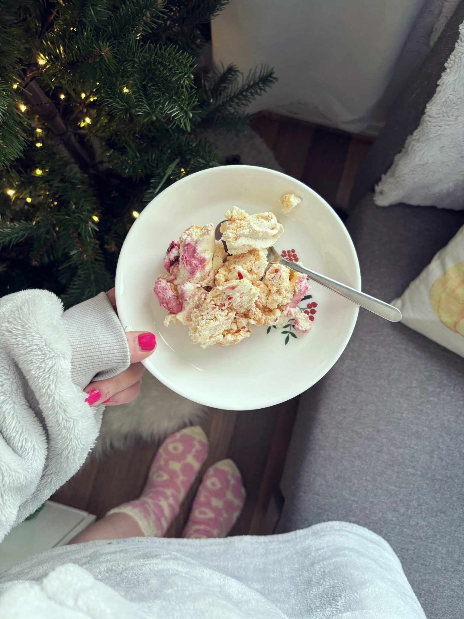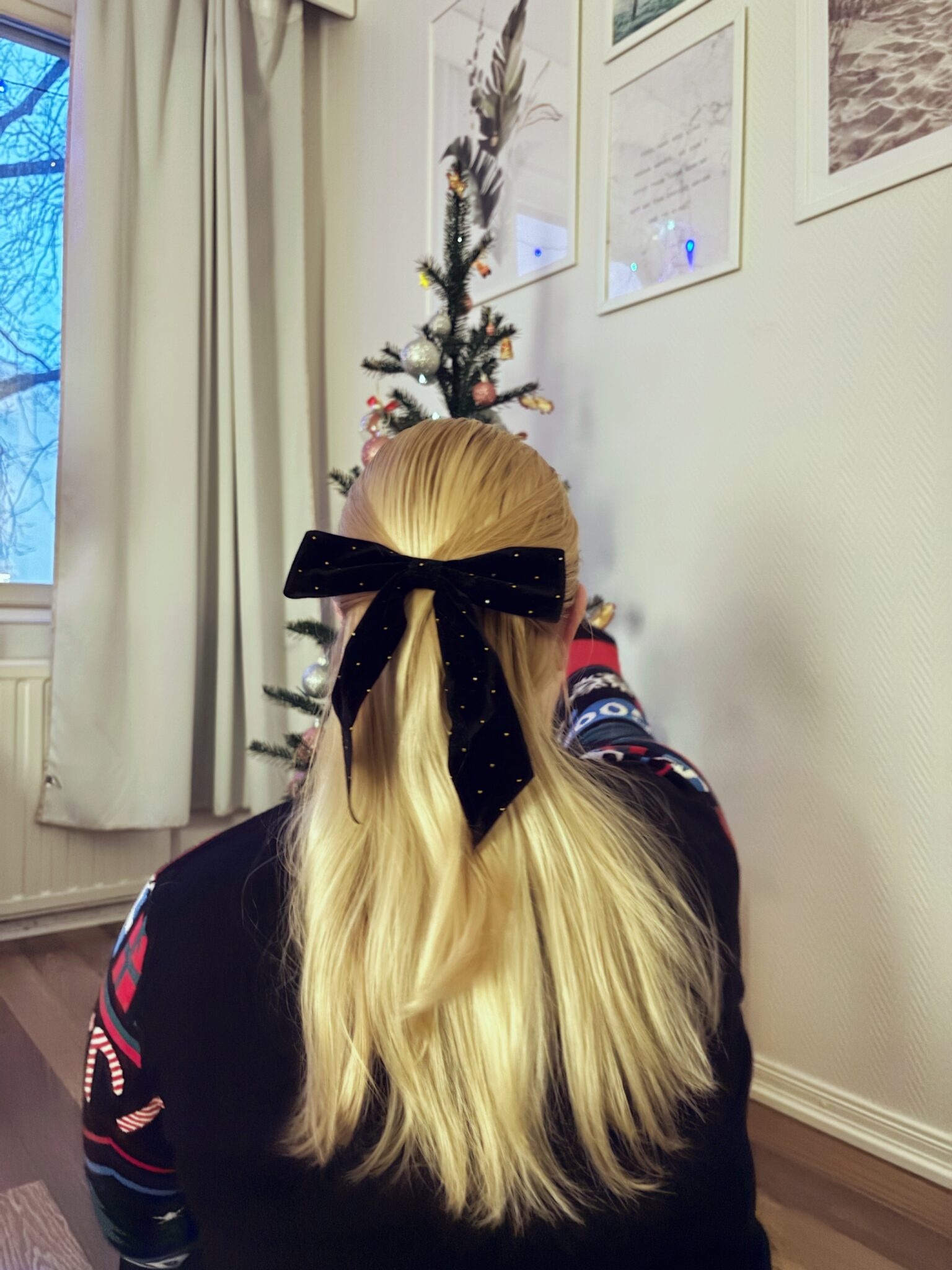 Vietettiin joulua tänä vuonna kahdesti, koska äiti lähti jouluksi Lappiin. Eka joulu vietettiin puolessa välin joulukuuta. Tein meille lounaaksi riisipuuroa, joka ehkä saattoi palaa vähän pohjaan. Tänä vuonna laitoin vain tuollaisen pienen kuusen, koska ei ollut oikein voimavaroja hössöttää. Koristeltiin kuusi yhdessä ja harmitti, kun en löytänyt mistään sellaisia isoja kultaisia rusetteja – olen laittanut ne tosi hyvään jemmaan. Avattiin lahjat ja lähdettiin ulkoilemaan ja tehtiin ruoaksi kanaa ja kermaperunoita.