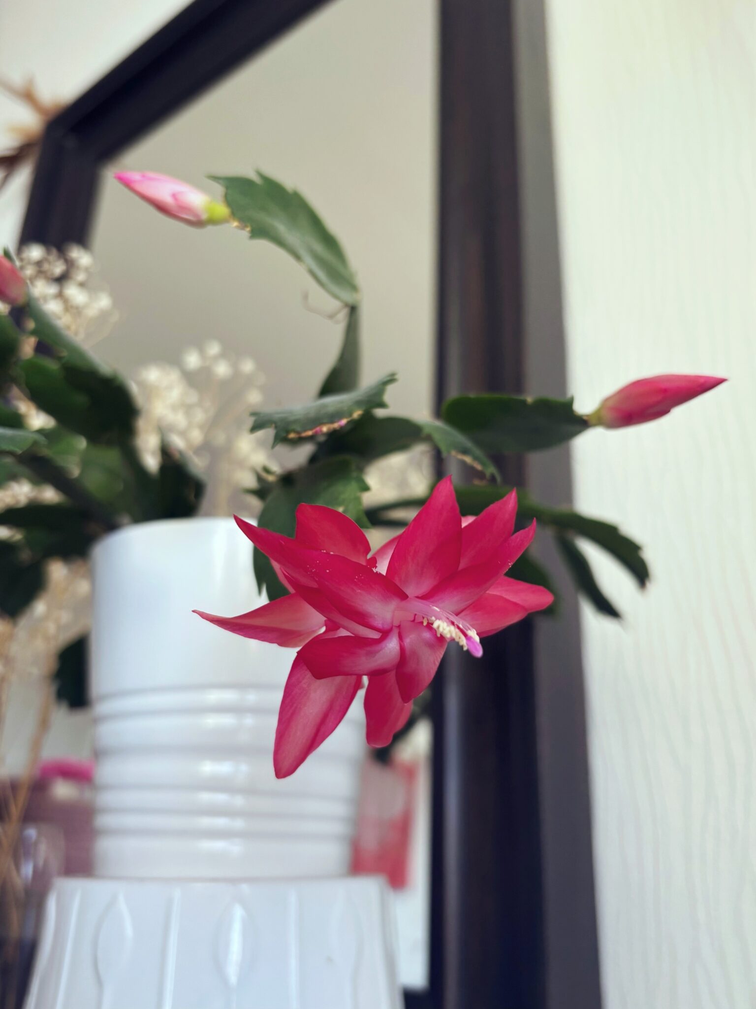 Ostin muutama vuosi sitten mammalle joulukaktuksen. Kun mamma menehtyi tuo sama kaktus päätyi sitten takaisin minulle. Kaktus on näyttänyt siltä, että se kuolee koska tahansa, mutta olen siitä yrittänyt huolehtia ja pidän sitä yöpöydälläni. Se tuo minulle eräänlaista lohtua ja turvaa – ja se muistuttaa mammasta. Mamma menehtyi 2023 ja kaktus ei ole kukkinut sen jälkeen kertaakaan, mutta eräänä tammikuun aamuna huomasin, että kaktuksessa oli pienet vaaleanpunaiset nuput ja se alkoi kukkimaan – ihanaa! Tietenkin salaa ajattelin, että se oli merkki mammalta, että kun itseäni masensi niin hän piristi minua kukilla.