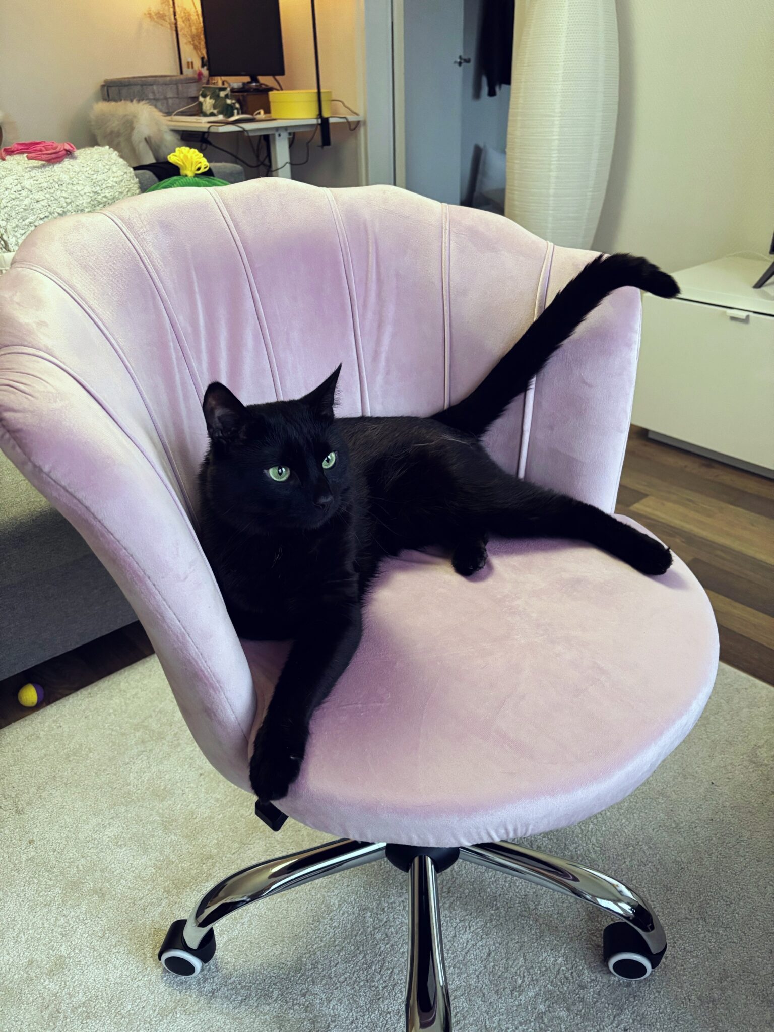 Mun työpaikka tilasi mulle mun unelmieni vaaleanpunaisen työtuolin, joka kävikin melkoisen seikkailun ennen kuin se löysi Turkuun saakka. Muistaakseni tuolin reissailuihin meni 3-4 viikkoa. En saanut lähetyksestä mitään yhteydenottoa ja kun aloin ihmetellä missä tuoli viipyy lähdin selvittämään asiaa ja soitin UPS-asiakaspalveluun. No sieltä kerrottiin, että tuoli oli lähetetty jo takaisin lähettäjälle, koska kuski ei ollut päässyt sisään rakennukseen eli mun kerrostaloon, jossa asun. Kerroin ystävällisesti, että kukaan ei ollut yrittänyt minulle soittaa, ei ollut tullut viestiä, mailia – ei mitään. Asiakaspalvelija kertoi, että heidän kuskeilla ole työpuhelimia, että he voisivat soittaa asiakkaalle. Se onkin lähetti-firmassa varmaan tosi kätevää jos ei voi soittaa asiakkaalle. Olin yhteydessä suoraan tuolin myyjään ja hänkin ihmetteli koko juttua, pahoitteli kovasti (vaikka tämä oli UPS:n vika ei hänen) ja kysyi haluanko purkaa kaupan. Sanoin, että haluan saada sen tuolin, se on maksettu ja se on minun unelmieni tuoli. Myyjä laittoi tuolin tulemaan uudestaan ja nyt varmistettiin, että kaikki tietoni olivat paketissa ovikoodia myöden. Kun tuoli saapui ja sain sen kokoon, niin kissa omisi heti tuolin itselleen ja totesin, että se taisikin olla Napin kaivattu valtaistuin 😀