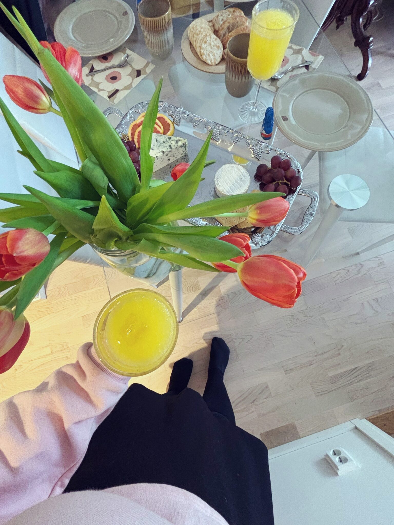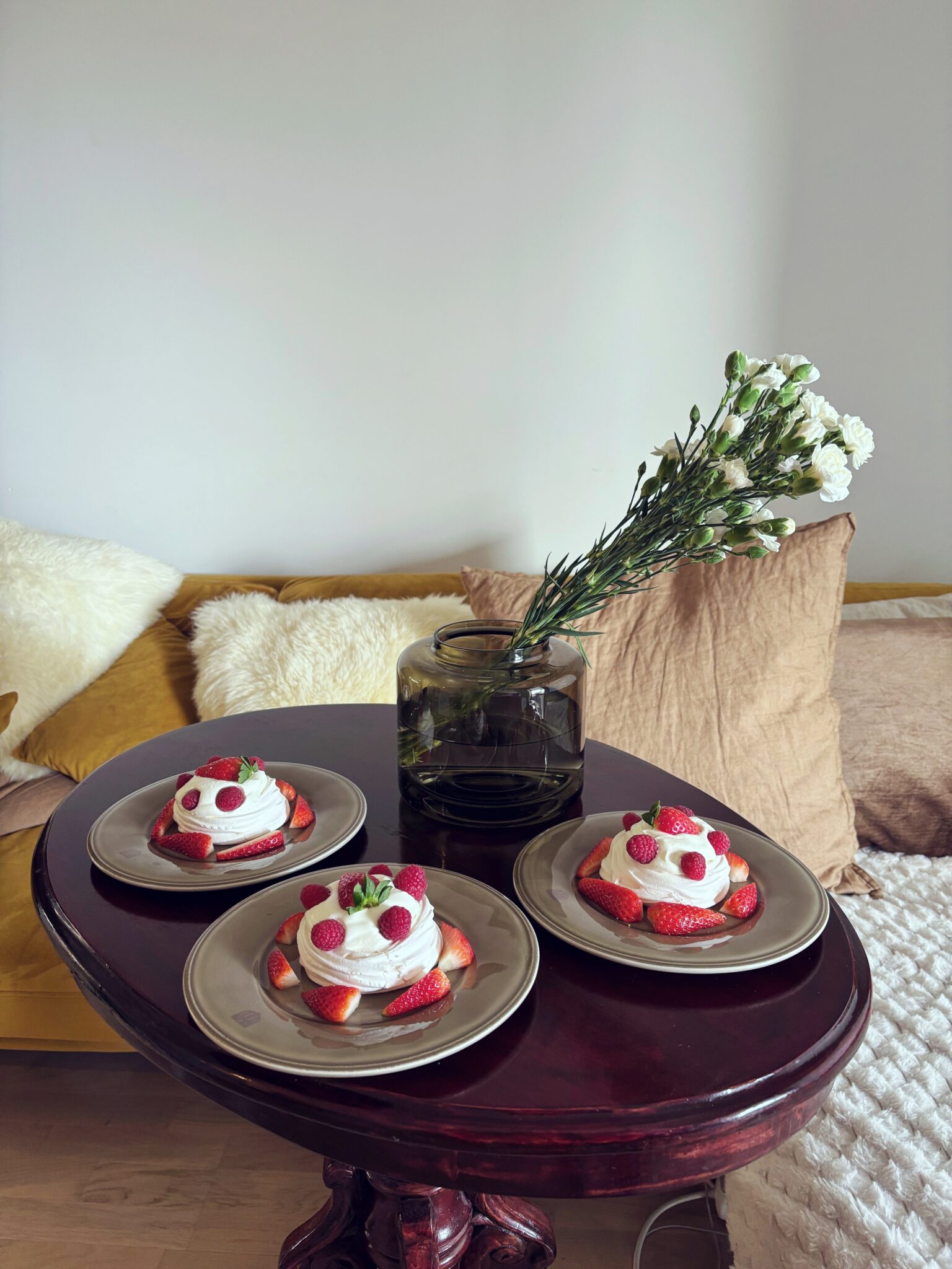 Optikon jälkeen hyppäsin taas bussiin ja suuntasin ystäväni luokse. Hän oli tehnyt ihanan kattauksen ja leiponut suolaista piirakkaa ja tehnyt juustotarjottimen. Jälkkäriksi hän teki meille annokset paplovaa ja oli kyllä niin hyvää ja tuli ihan kesä mieleen. Oli niin kivaa höpötellä koko päivä herkkujen ja kuohuviinin äärellä.