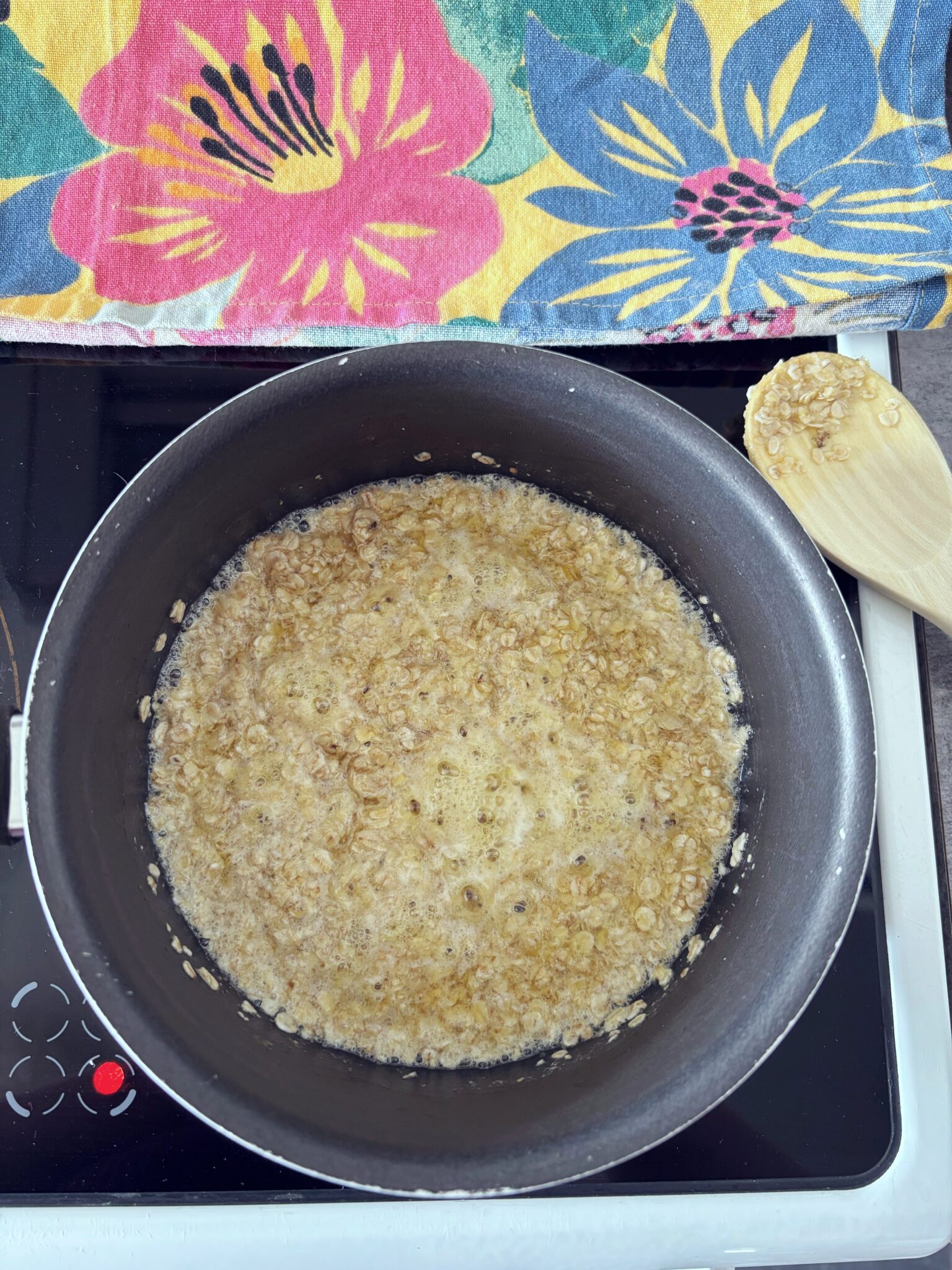 - Lisää joukkoon kaurahiutaleet ja sokeri.
