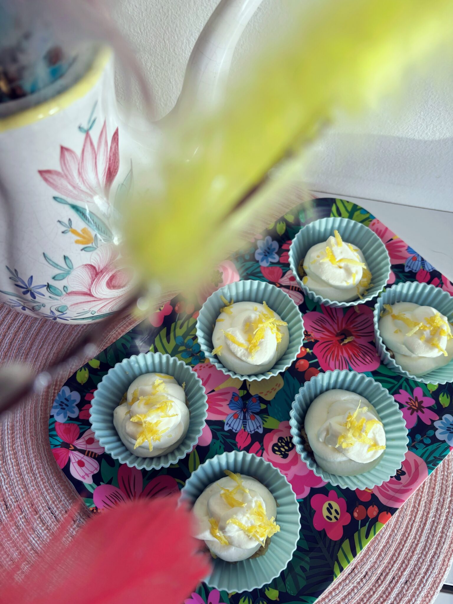 - Kun pohjat ja kuorrute ovat jähmettyneet, voit koota muffinssit: pursota kuorrute pohjien päälle ja raasta lopuksi sitruunan kuorta päälle 🍋