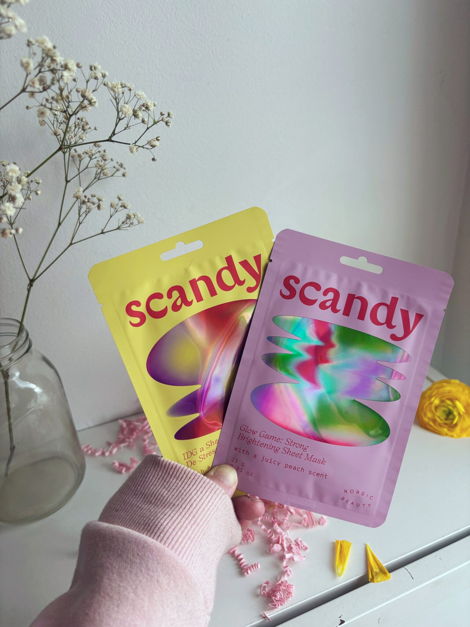Scandylla on tällä hetkellä kaksi erilaista sheet maskia: Glow Game: Strong Brightening Sheet Mask ja IDG a Sheet De-Stressing Sheet Mask. Glow antaa pika-apuna hehkua ja kosteutusta. Se sisältää ihoa helliviä ainesosia, kuten niasiiniamidia ja puolukkauutetta, jotka tasoittavat ihon sävyä, sekä antioksidanttipitoista glutationia ja lootusuutetta, jotka antavat iholle vertaansa vailla olevaa hehkua. DG a Sheet De rauhoittaa kasvojen ihoa lakritsinjuuri- ja kamomillauutteilla. Tämä naamio on mainio keino rauhoittaa ihoa pitkän päivän päätteeksi, kun iho tuntuu kuivalta ja stressaantuneelta.