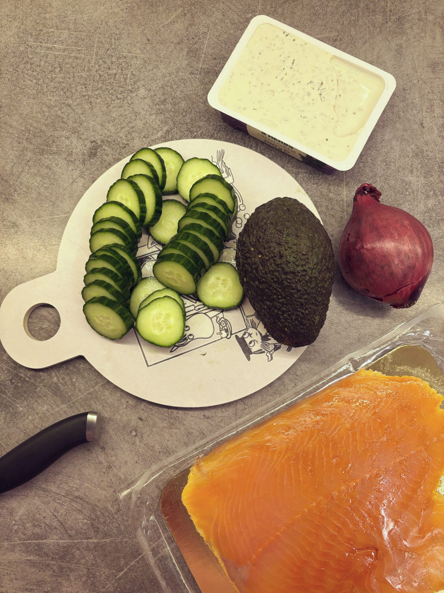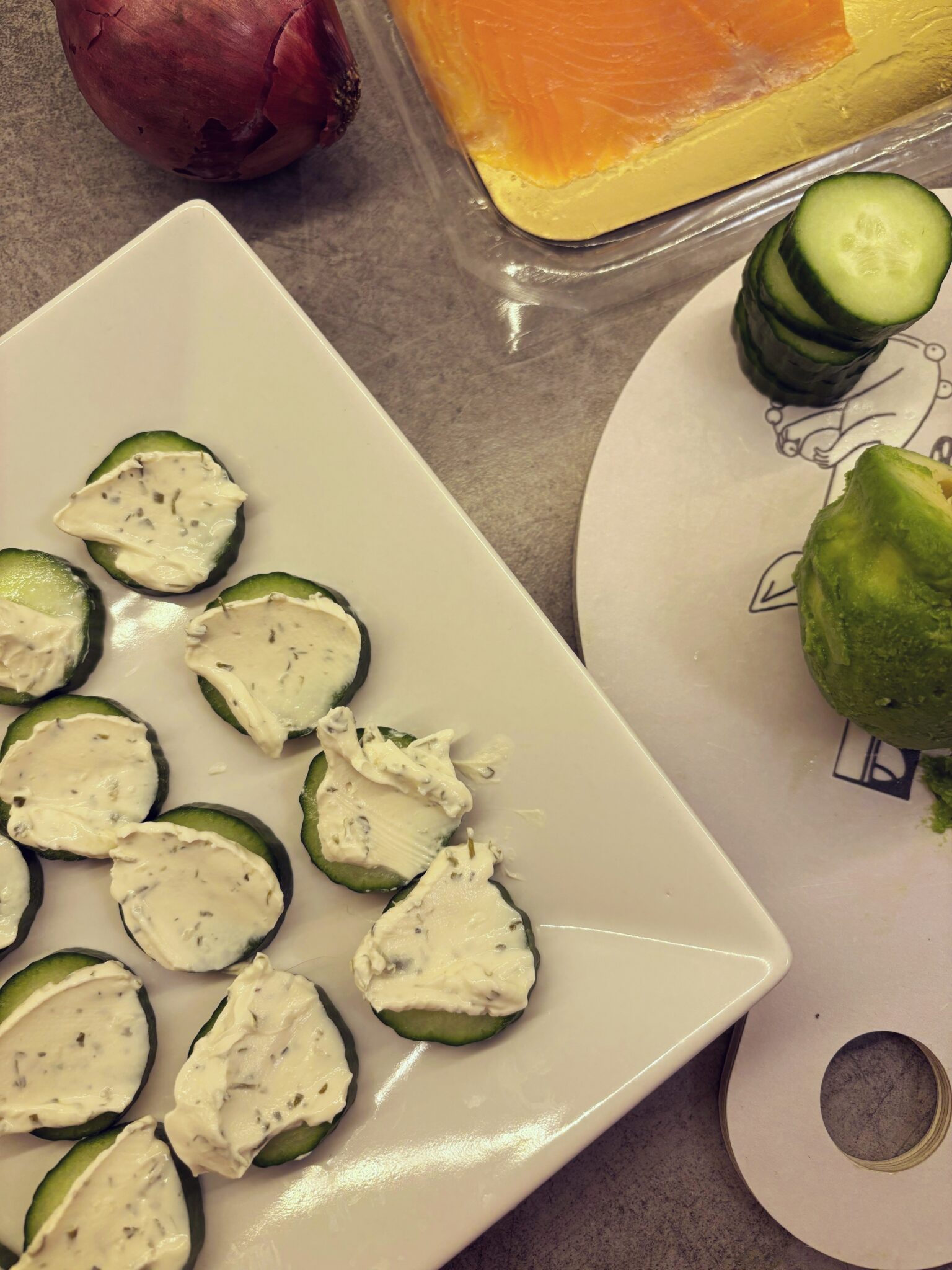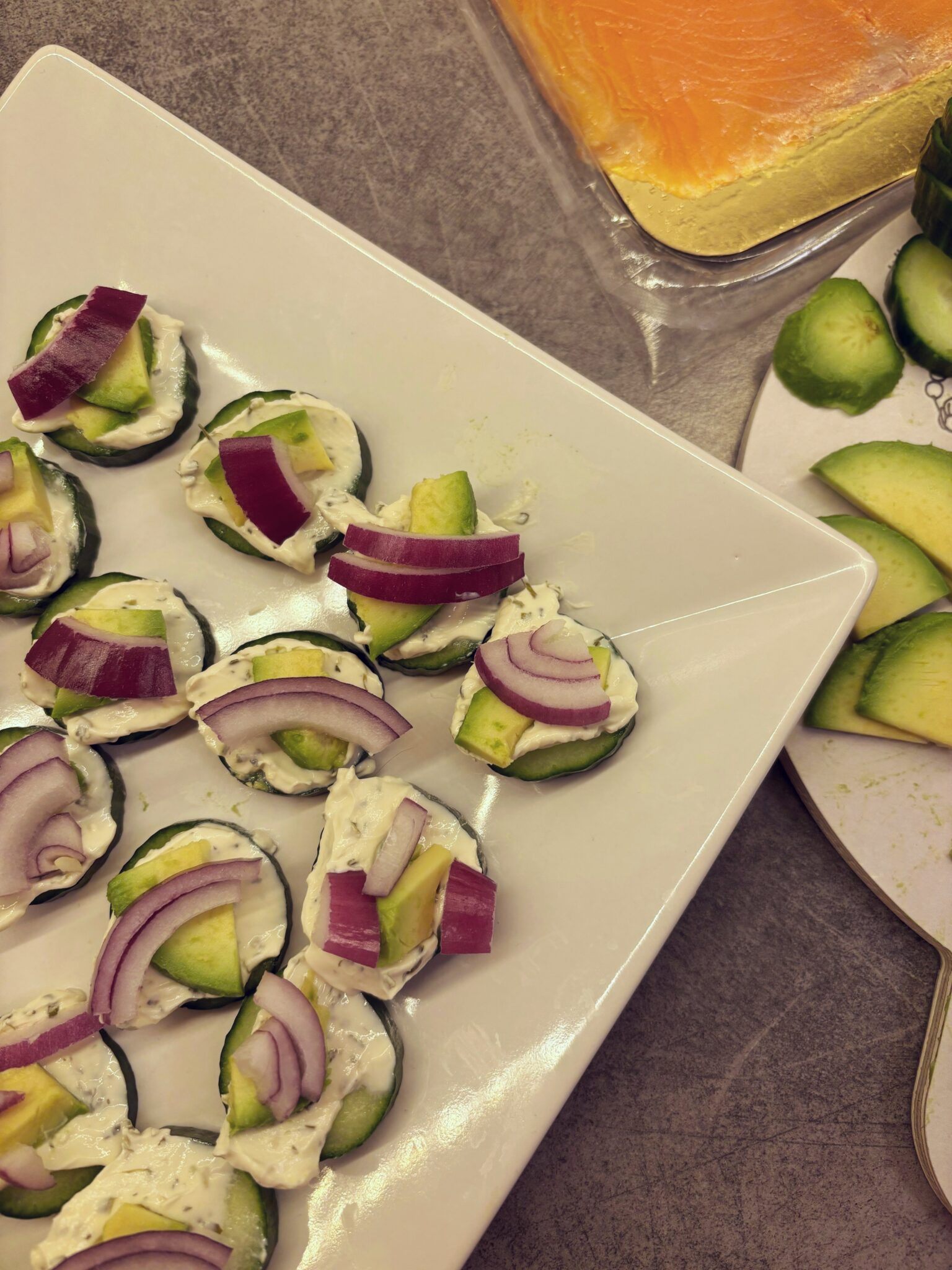 - Annostele kurkkujen päälle sipulia ja avokadoa (tuorejuusto pitää ne hyvin paikoillaan).