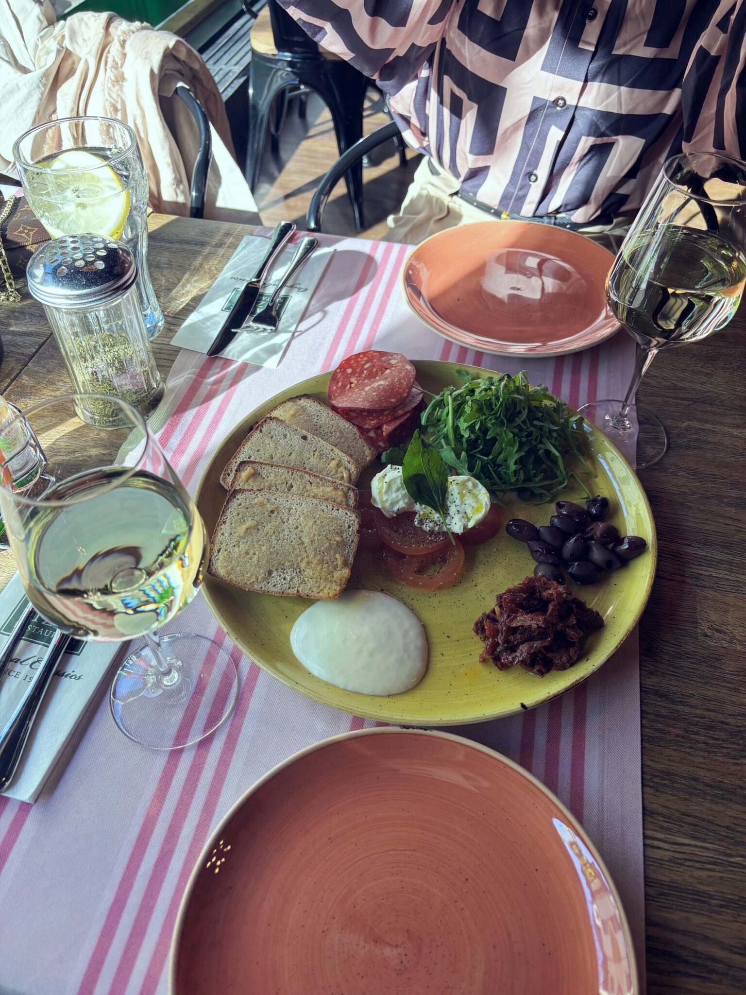 Ravintolassa oli ihanan tunnelmallinen ja lämmin sisustus ja pöytään oli mukava istahtaa. Tilasimme alkupalaksi jaettavaksi antipasto-lautasen valkoviinin kera ja kylkeen sai myös gluteenitonta leipää. Oli ihana napostella antipastoja kera hyvän viinin ja höpötellä Minnan kanssa. Pääruoaksi otimme jaettavaksi lihapullapastan ja Caesar Deluxe -pizzan, jossa oli kanaa, caesarsalaattia, parmesania ja rapeaa pekonia. Mulla on vähän huonoja kokemuksia ravintoloiden gluteenittomista pastoista, mutta tämä pasta oli todella hyvää – ei yhtään sellaista kuivaa ja tahmeaa. Pizza oli myös todella hyvää ja annokset olivat reilun kokoisia – ainakin meidän mahoille! Jälkiruoaksi otettiin vielä herkulliset jätskit nam!