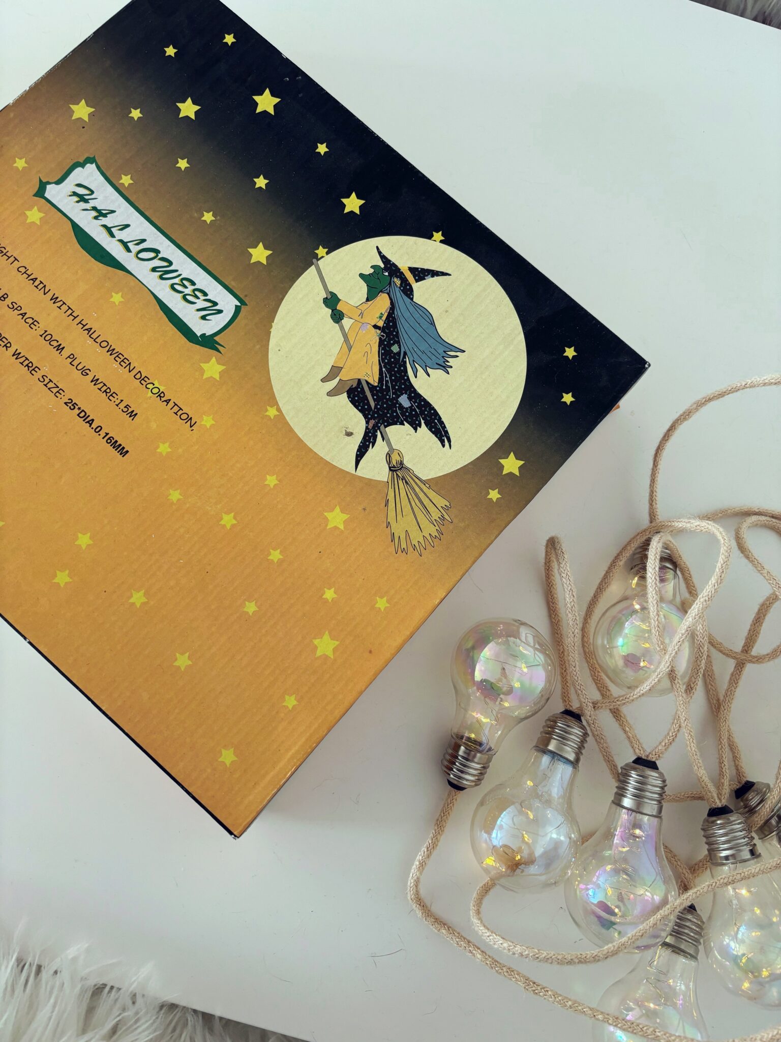 Ystäväni oli löytänyt viime vuonna kirppikseltä kummitus -valosarjan, jonka hän osti minulle ja toi oven taakse. Tätä yllätystä en kyllä unohda koskaan, sillä olin aivan haltioissani, kun näin valosarjan. Ensinäkin tuo paketti on jo niin kaunis ja retro, että lensin siinä samassa suoraan johonkin 80-luvun halloweeniin. Valitettavasti valot saadessani oli alkanut jo marraskuu ja mulle marraskuu tarkoittaa jo jouluhommia, joten valot eivät enää ehtineet esille, koska olin kerännyt jo syksyn sisustuksen pois. Mutta nyt kummitusvalot pääsivät ekaa kertaa käyttöön ja voi, että kuinka suloiset ne ovatkaan!