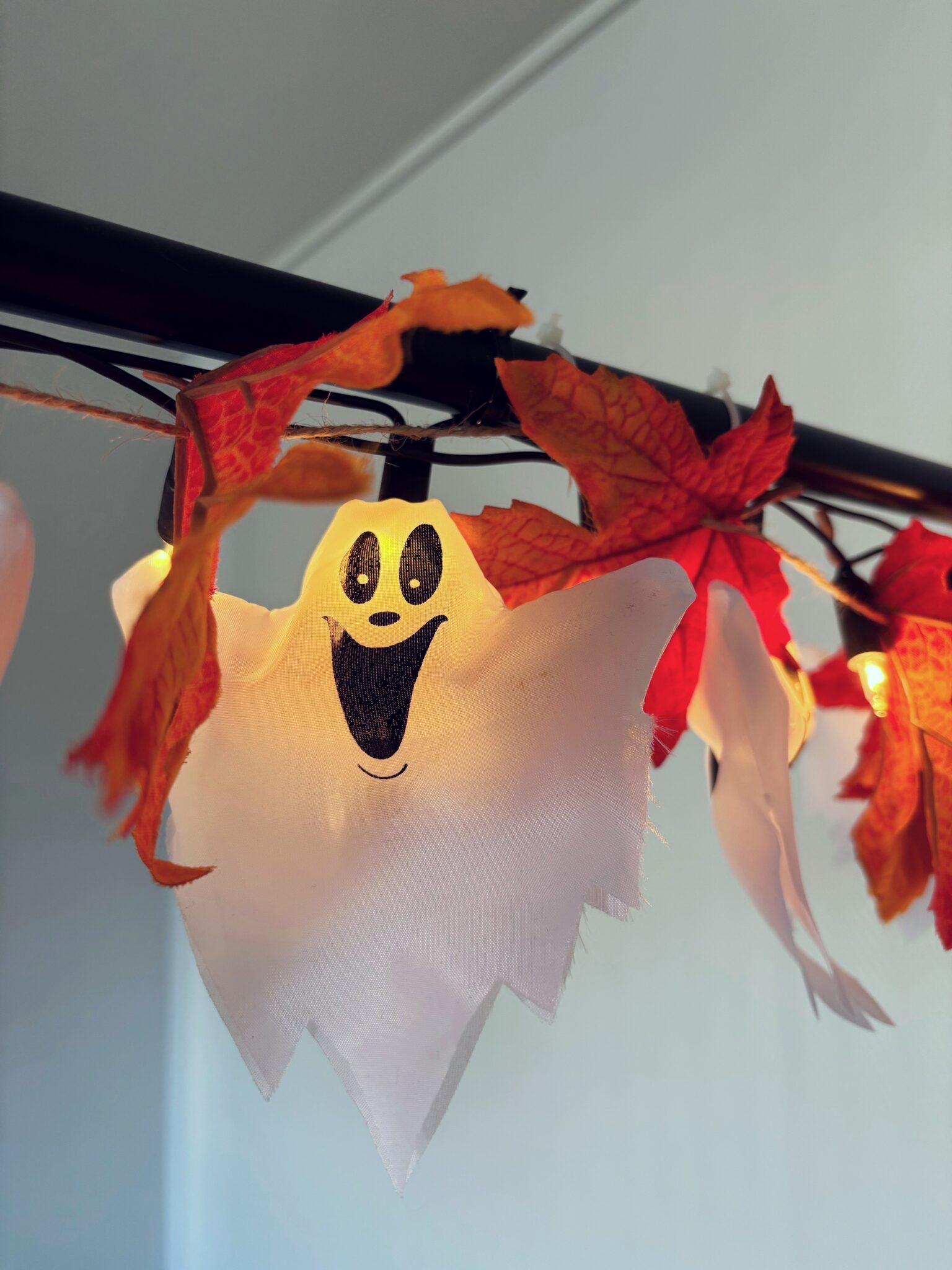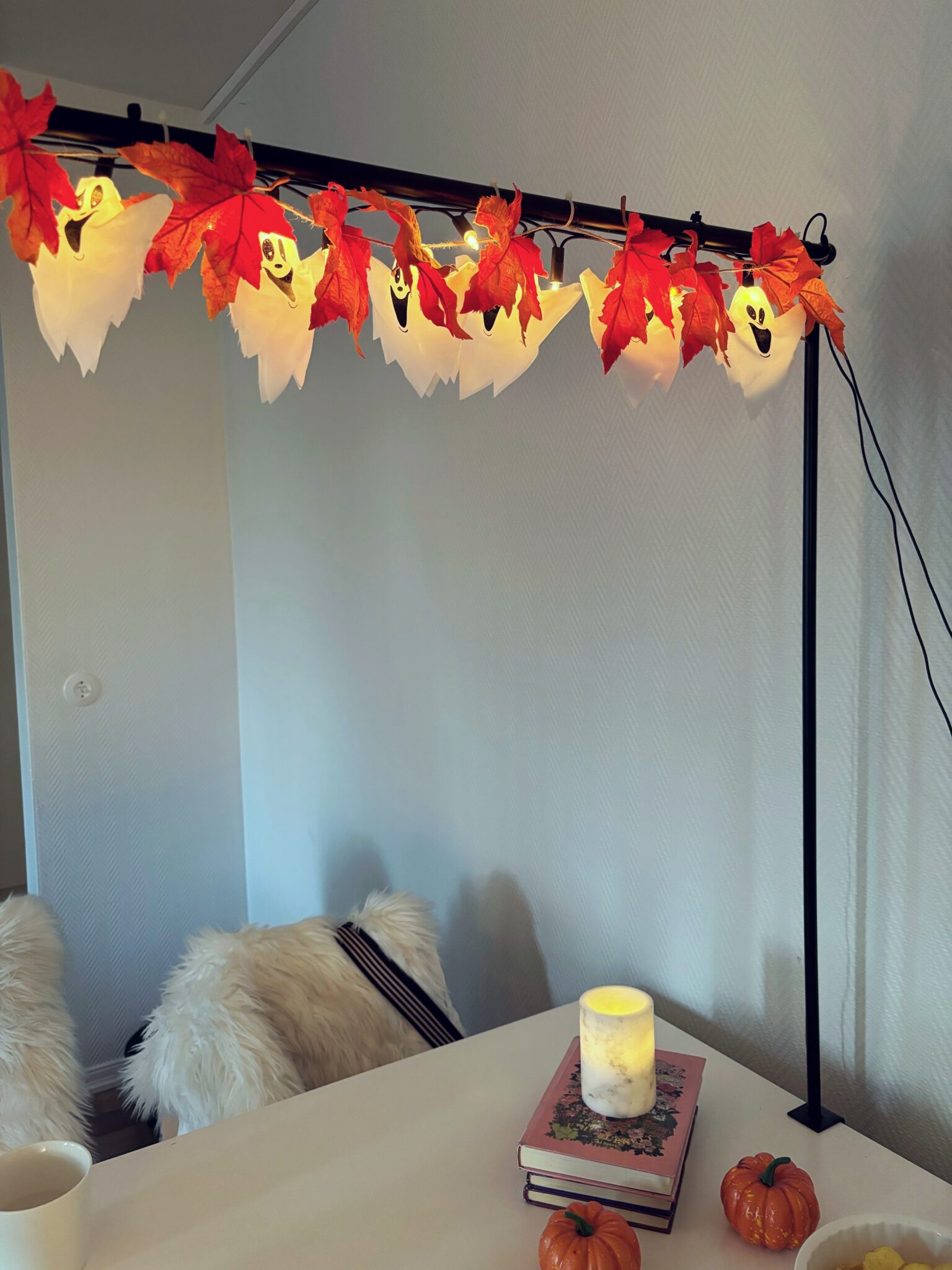 Kiinnitin valosarjan nippusiteillä kiinni telineeseen. Jouduin ottamaan muutaman haamun irti, koska niitä oli liikaa ja ne tursuivat päällekäin. Askartelin viime vuonna koriste-irtolehdistä kauniin nauhan, jota pidin viime syksynä sängyn yllä. Mä en muuten tiedä mistä nuo lehdet ovat peräisin, ne ovat lojuneet mulla laatikossa vuosia ja joskus somistin niillä kenkäkauppaakin ollessani siellä töissä. No nyt lehdet saivat arvoisensa aseman, kun ripustin ne pöytätelineeseen kummitusten sekaan.